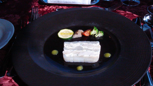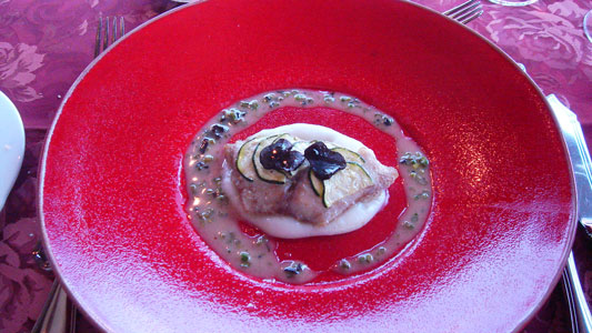 お魚。黒鯛のグリル。お兄さんがお料理の説明をしてくれるんですが、「黒鯛の上にはズッキーニとトリュフ、ソースはカボスベースです」