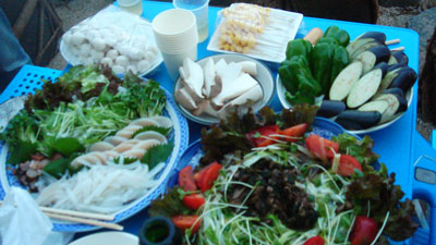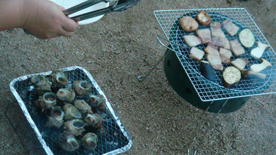 5時すぎ、Mちゃん旦那が火を起こしてくれてる間に、材料とか刺身とかを並べる。