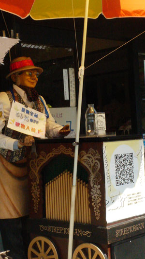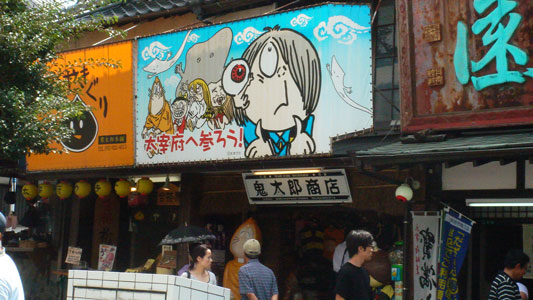 ひときわ異彩を放つ、軒先でぐるぐるとオルゴールを回すおじさんの人形と鬼/太郎ショップ。なぜ。