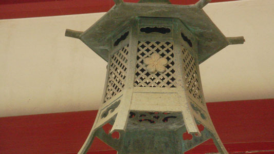 本殿の裏手。灯篭が下がっています。もちろん梅があしらってあります。