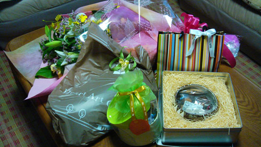 花束と、プレゼントたち。KくんとMくんとSちゃんと他事務所の同期のT兄から。