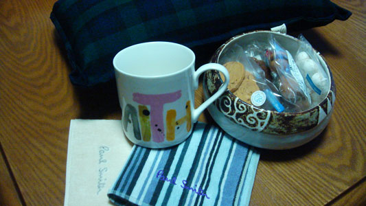 Kくんは低反発のクッション。Mくんはポー/ルス/ミスのタオルハンカチとマグ。T兄は自作(陶芸をやってる)の器にお菓子の詰め合わせ。