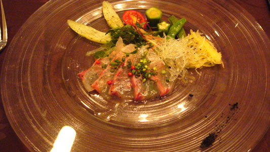 前菜:鯛のカルパッチョ。右下の黒いのは岩塩らしいです。炭かと思った。(え)
