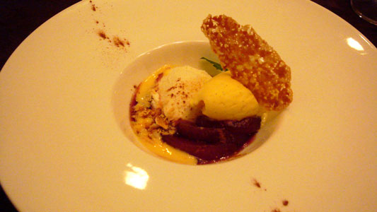 デザート:洋ナシの赤ワイン煮、カルピスのムース、バニラアイス。