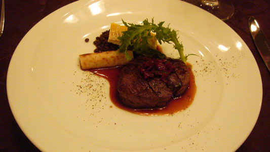 メイン:牛フィレ肉のステーキ。葉っぱが・・・辛かった。カラシ菜・・・じゃないよね。山葵の葉?