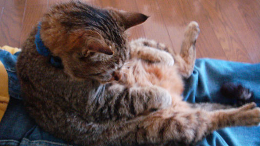 ふい~やれやれ、な感じでFの膝の上で寛ぐレン。