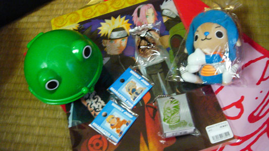 クリアファイルとピンバッジ(1部ナルと仔カカ)、ガマちゃん財布型貯金箱(中にハッ/ピータ/ーン味のおせんべい入り)ベジータVerチョッパーマンぬいぐるみ。あと、ゲーセンでゲットしたというカカシのキーホルダー。